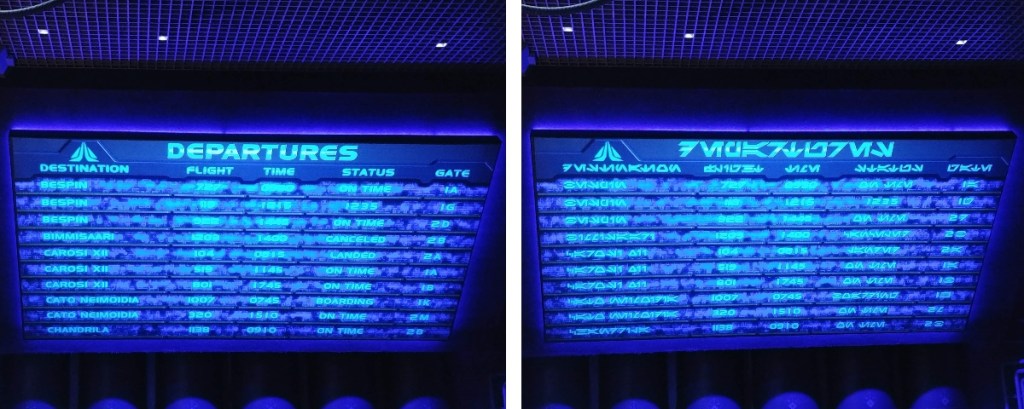 Overall, the attraction’s aesthetic is that of an airport or other commercial transportation facility. Riders enter the queue under the direction of illuminated signage displaying English text paired with the same messages in an invented alphabet. Pieces direct visitors to various locations within the attraction and provide procedural information such as pick-up and drop-off locations for 3-D glasses. Large screens overlook riders on their way through a terminal area, offering arrival and departure information interspersed with advertisements for the company’s tour destinations (see above). Posters bearing similar advertisements line the walkways at the conclusion of the attraction, and the silhouettes of an assortment of passengers (representing several of the franchise’s more recognizable species) can be seen through simulated doors and windows.
